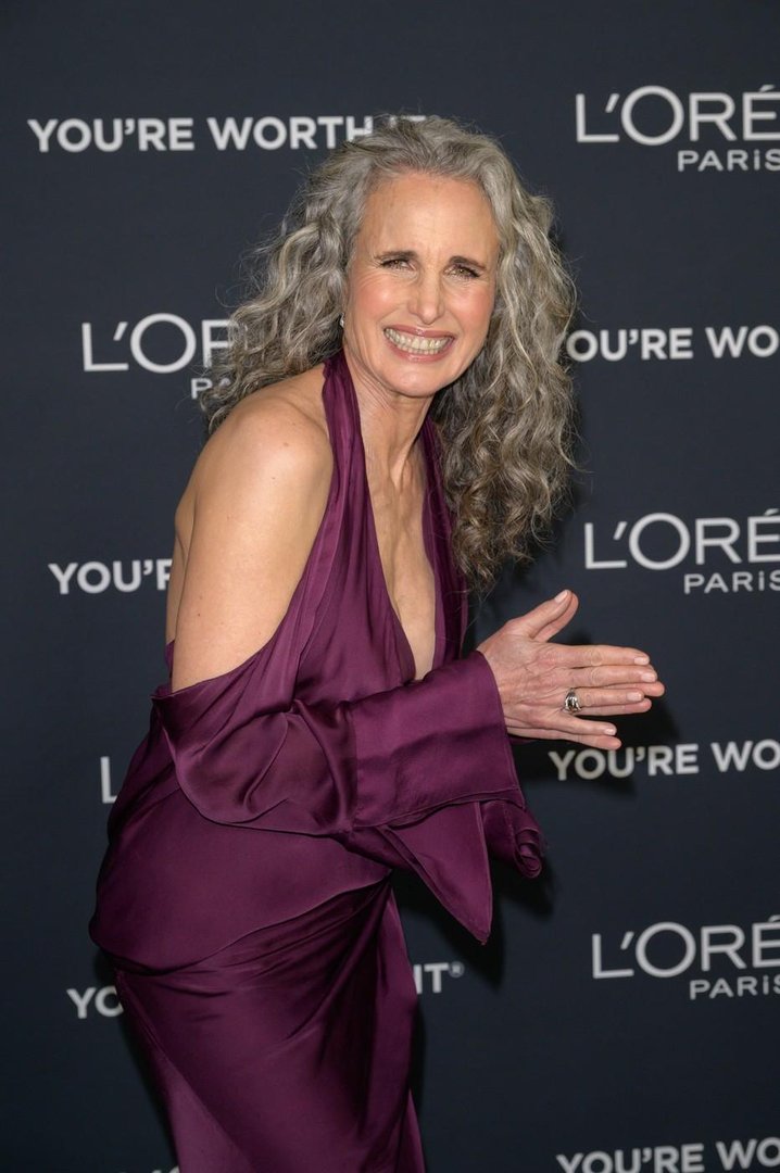 Sivi lasje, ki jih Andie nosi z izjemno eleganco, so postali njen zaščitni znak – dokaz, da se zrelost in slog odlično dopolnjujeta. Za to priložnost je nosila dolgo obleko v vijoličasti barvi, ki se je popolno ujemala z njenimi lasmi. Vijolična je namreč barva, ki srebrni oziroma sivi laska bolj kot katerakoli druga.