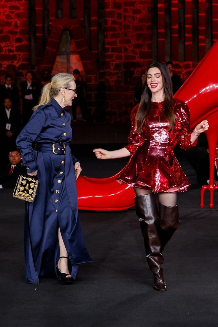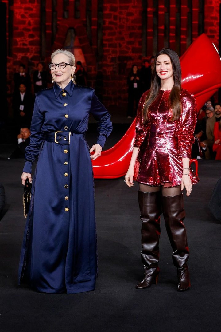 Na drugi strani je Anne Hathaway ubrala precej drznejšo modno potezo. Njena rdeča mini obleka s bleščicami znamke Stella McCartney, kombinirana z visokimi škornji čez kolena, je takoj pritegnila poglede. Stajling je bil energičen, opazen in pogumen, a kot celota je pri nekaterih pustil tudi nekaj dvomov.