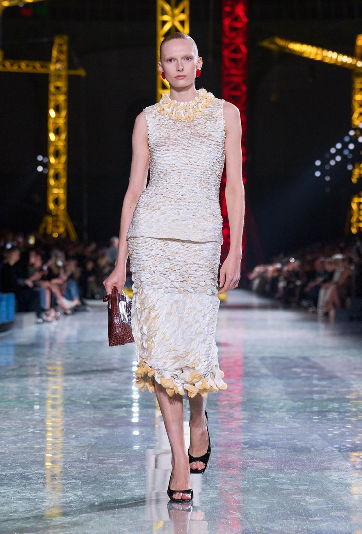 Dialog med resničnim in umetnim, ki prežema celotno kolekcijo, doseže vrhunec v dodatkih. Kot iridescentna impresionistična slika se opalescentni odtenki odražajo v nakitu iz barvno nasičenega emajla in smole ter v umetno obarvanih kosih prave biserne matice. Škornji, ki se oprimejo stopala kot druga koža in imajo kontrastne kapice, poudarjajo občutek neresničnosti v pastelnih, mehkih usnjih. Torbe pa segajo od praktičnih do igrivih: od že znane, nepogrešljive suede flap torbe, ki v bež različici hitro postaja klasika in ima vzorec »divan matelassé«, neposredno navdihnjen z zofe v stanovanju Gabrielle Chanel, do najnovejše torbe z »kinetično« ključavnico in ekstravagantne minaudière v obliki granatnega jabolka z emajlirano, skoraj strupeno iridescenco.
