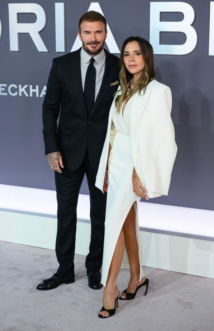 Victoria Beckham je medtem na premieri predstavila nekoliko bolj poslovno modni kos. Nosila je dolgo ozko belo krilo z drznim stranskim razporkom, bluzo ter oversized suknjič v enaki barvi. Za kontrast je izbrala črne čevlje z vrtoglavo visoko peto, svoj videz pa je zaključila z nekaj elegantnimi kosi nakita.