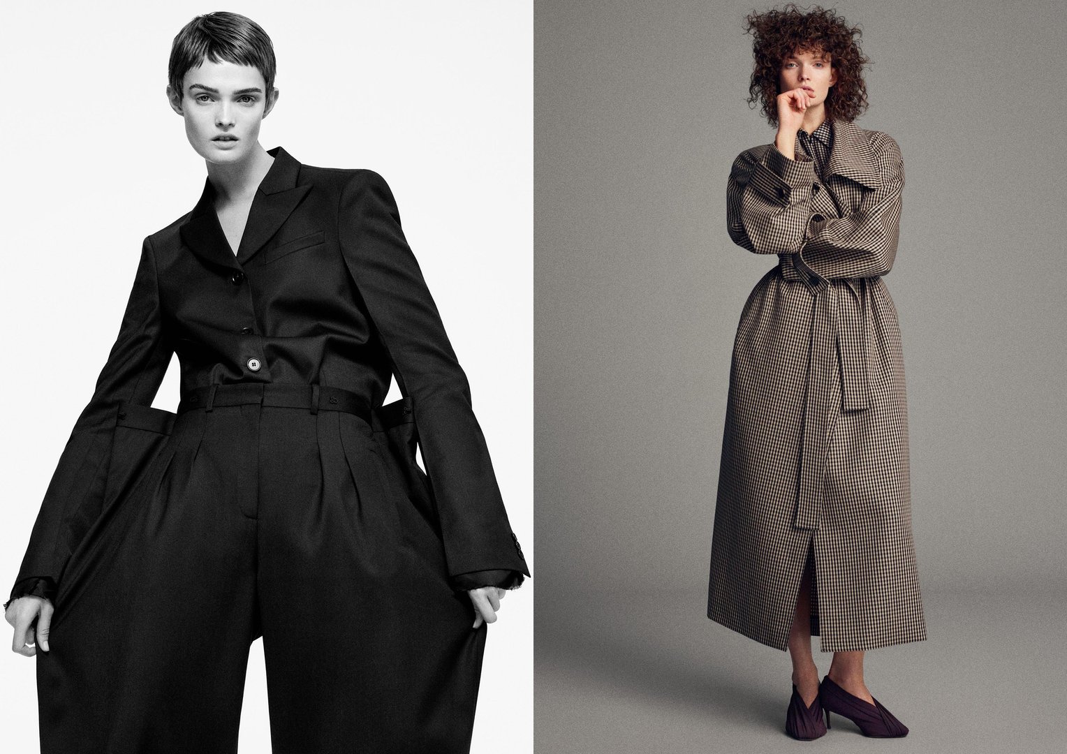 Ravnovesje se vedno rodi v konstrukciji. Silhueta je lahko pristno ekscentrična – napihnjena ramena, strukturiran volumen, podaljšan vratni izrez – a če je kos dobro izdelan in premišljeno proporcionalen, nikoli ne prestopi meje ne‑nosljivega. Odličen primer je rjavi karirasti plašč. Ohlapen, skoraj kimono ovratnik je nenavadna odločitev, a prav ta poteza mu daje občutek objema in lahkotnosti. Ekscentričnost in udobje sta v resnici isti lastnosti – neločljivo povezana.