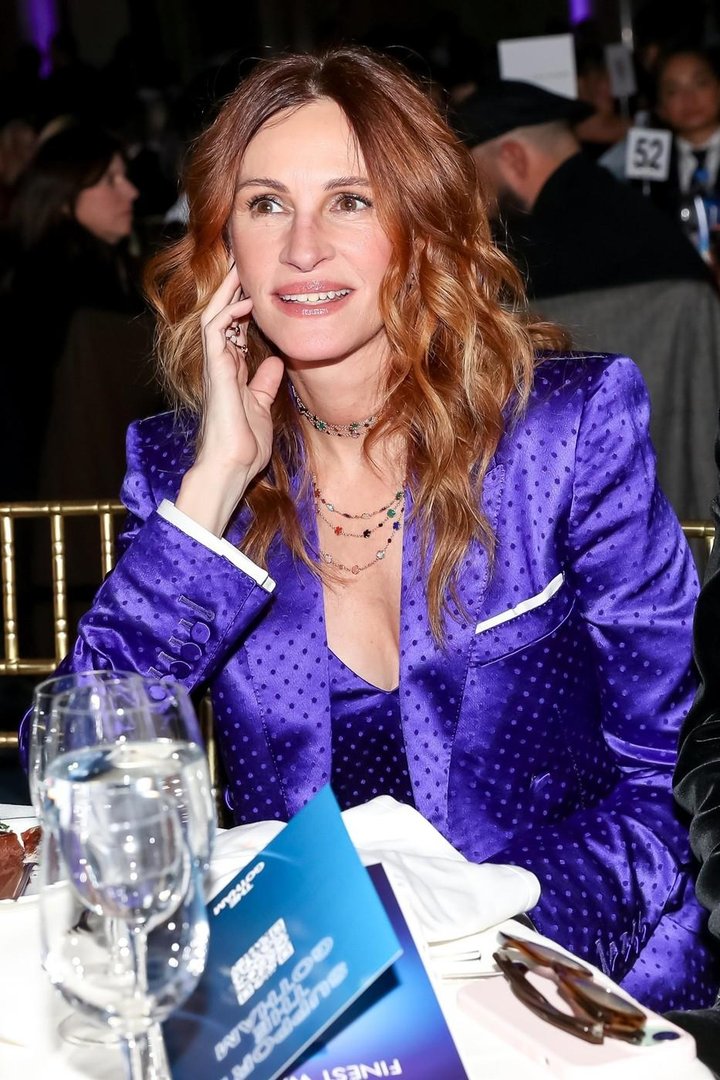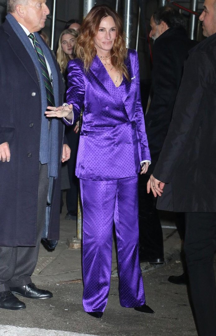 Za to priložnost je Julia Roberts izbrala izjemno vpadljiv satenasti kostim v intenzivni vijolični barvi. Tkanina je bila nežno posuta z drobnimi pikicami, ki so dodale kanček igrivosti in prefinjenosti.