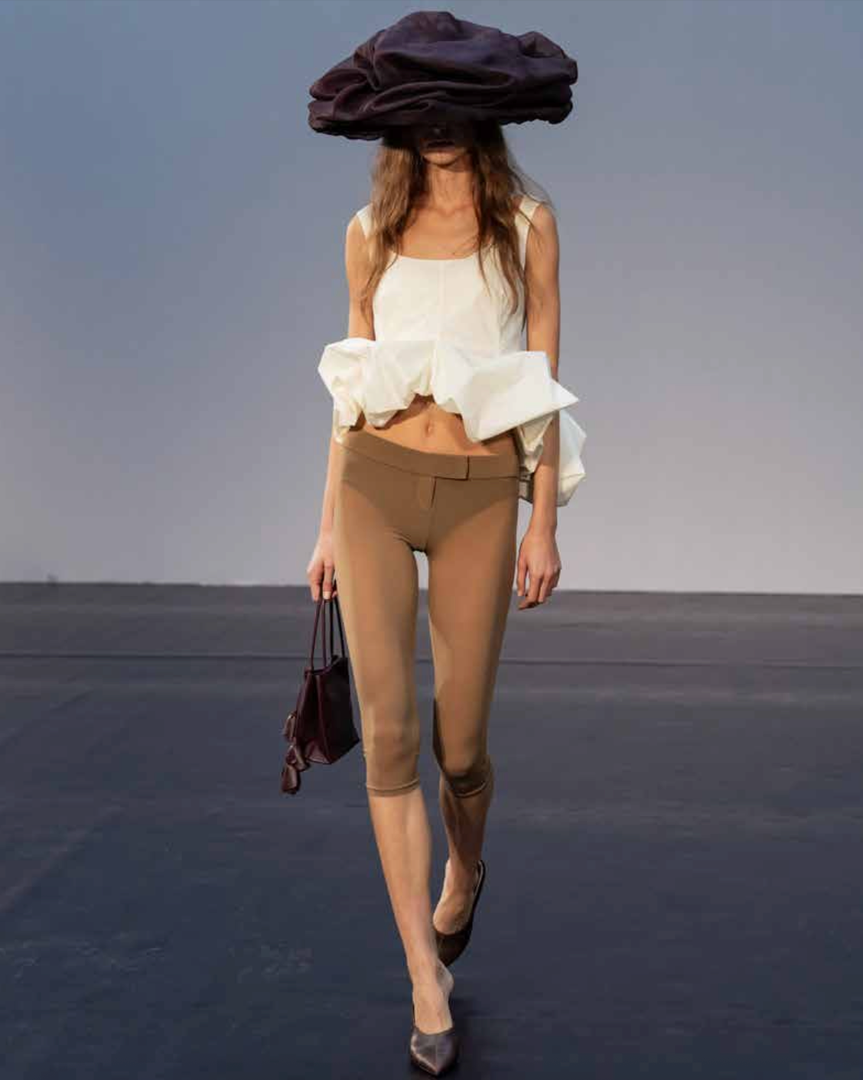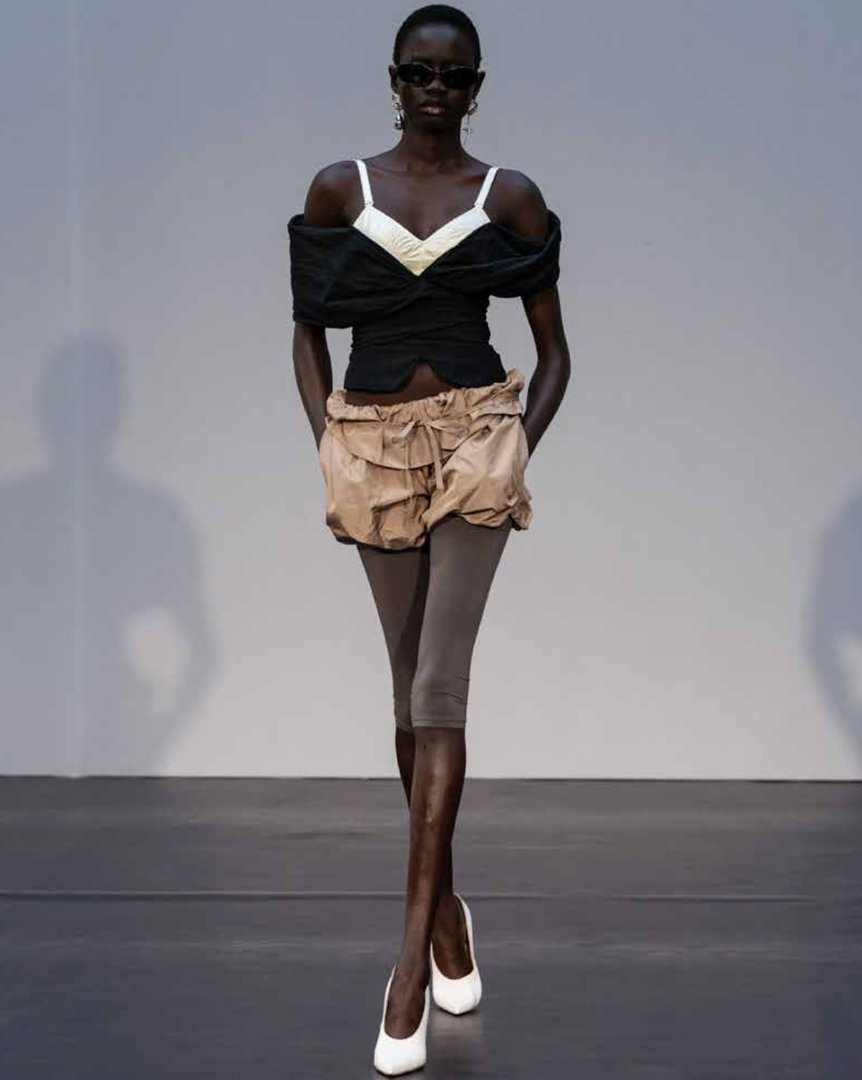 - Ultrakratke silhuete z nabranimi ali nagubanimi detajli, ki ustvarjajo kiparsko prostornino.