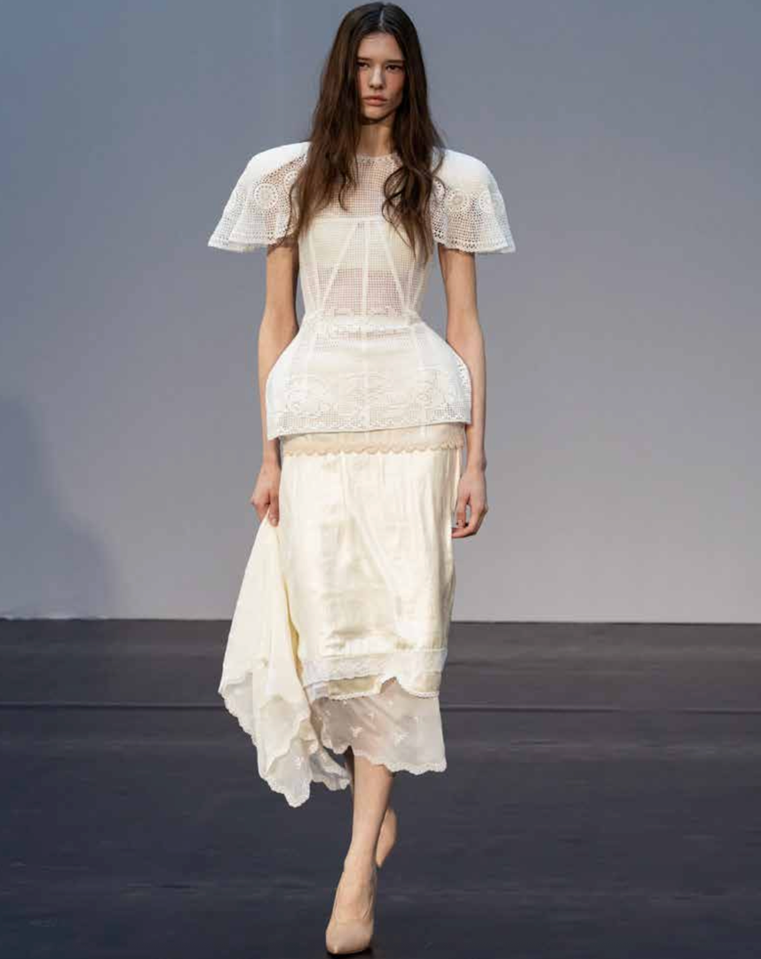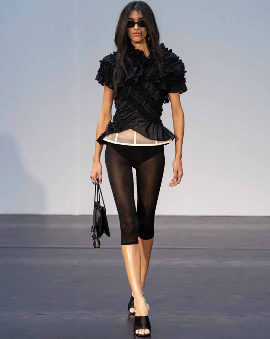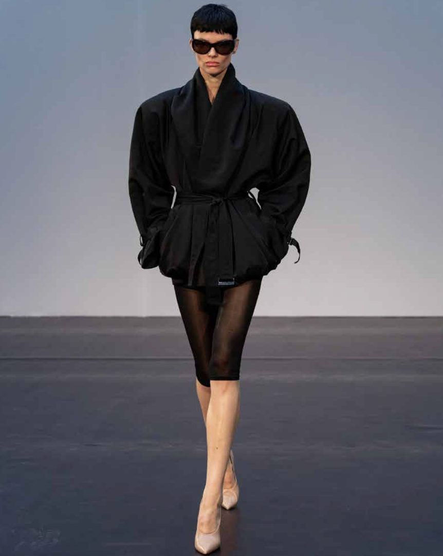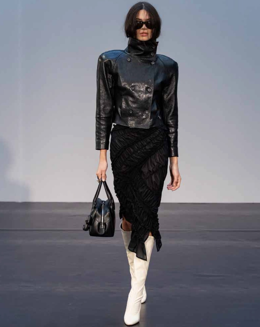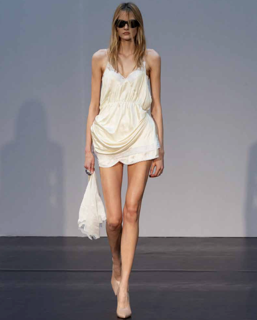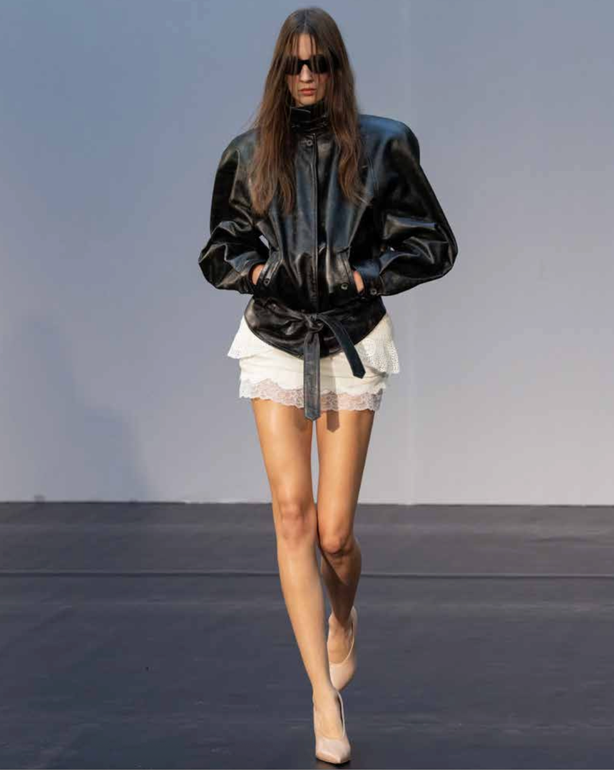 To sezono je ženskost destilirana v skrajšane proporce in hipersenzualne oblike. Mini dolžine določajo tako krila kot zgornje dele, medtem ko s perilom navdihnjeni topi s čipko in spodnje obleke prikličejo intimnost, prežeto z močjo. Usnjene jakne z izrazitimi rameni in oprijetimi pasovi se nosijo z lahkotno samozavestjo, brišejo meje med krojenjem in večernim videzom.