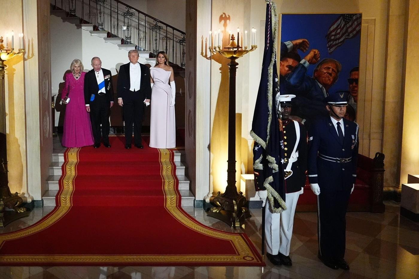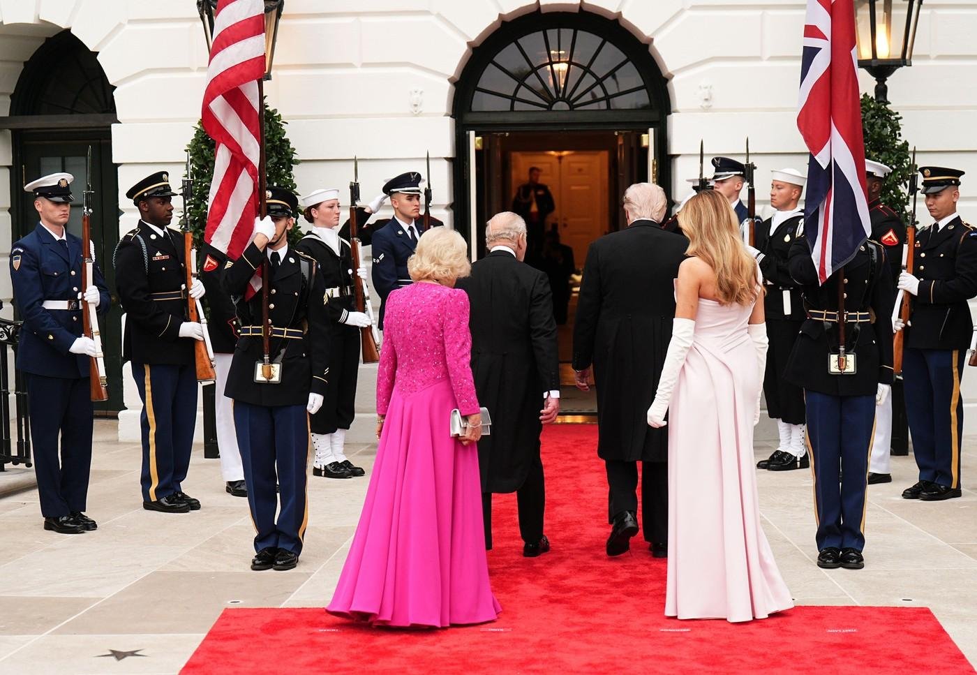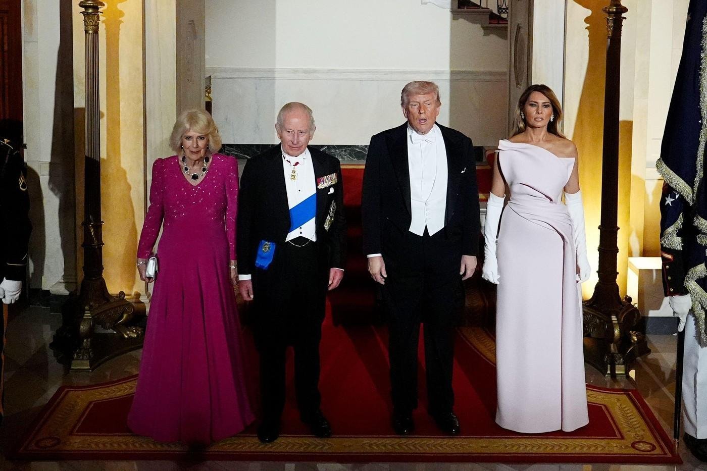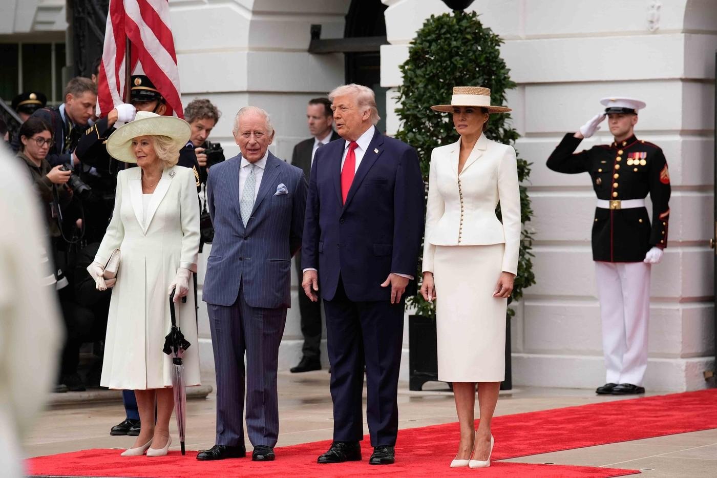 77-letni Kralj Karel in 78-letna kraljica Camilla sta v Združene države prispela v ponedeljek, v Beli hiši pa sta ju sprejela Melania Trump in predsednik Trump. Prva dama je ob prihodu izbrala kostim s krilom v maslenem odtenku ameriškega oblikovalca Adama Lippesa.