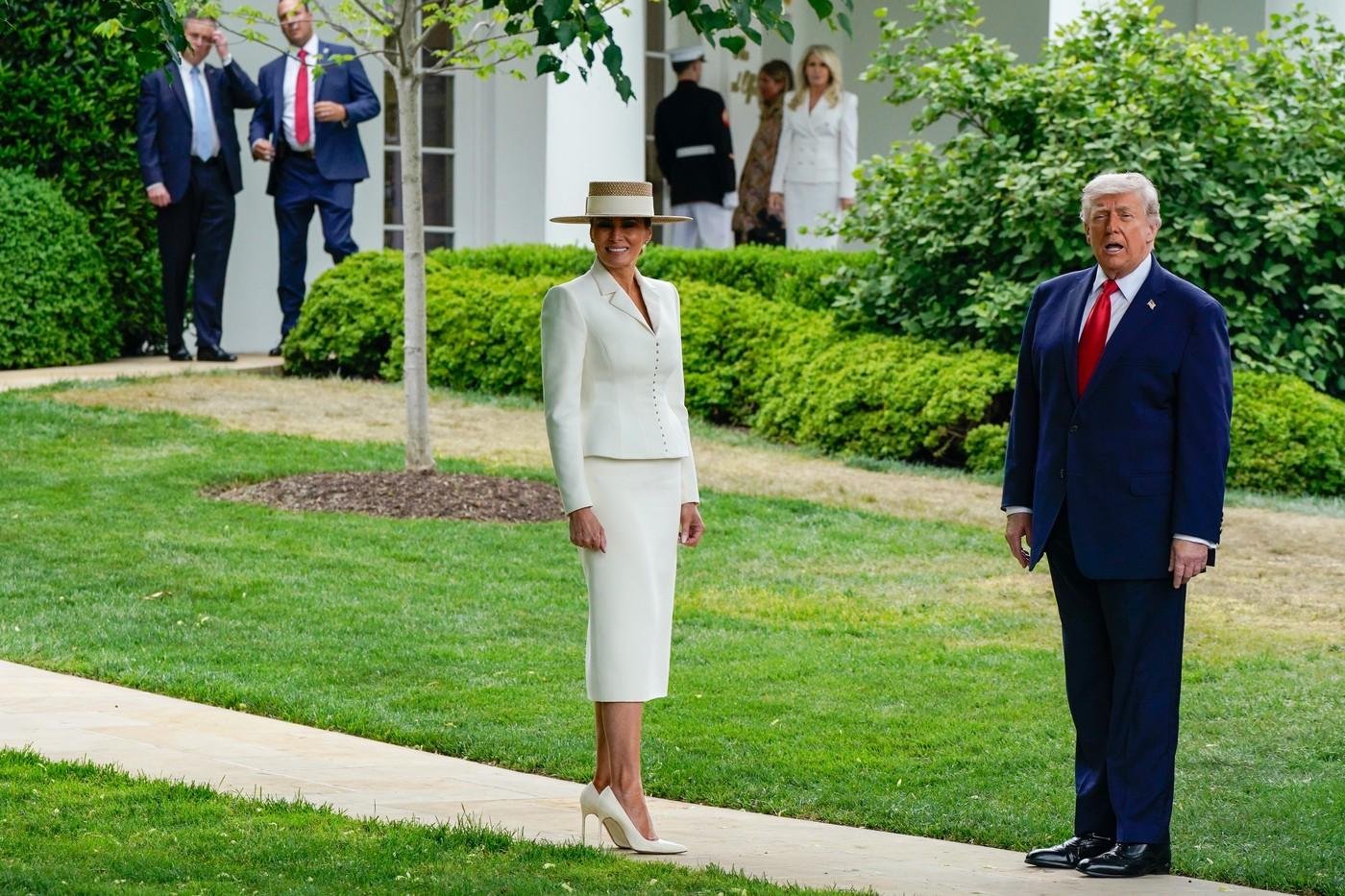 Melania je navdušila tudi v belem kostimu Ralpha Laurena, sestavljenega iz krila in suknjiča s peplum krojem. Opravo je dopolnila s slamnatim klobukom Erica Javitsa in belimi salonarji znamke Manolo Blahnik.