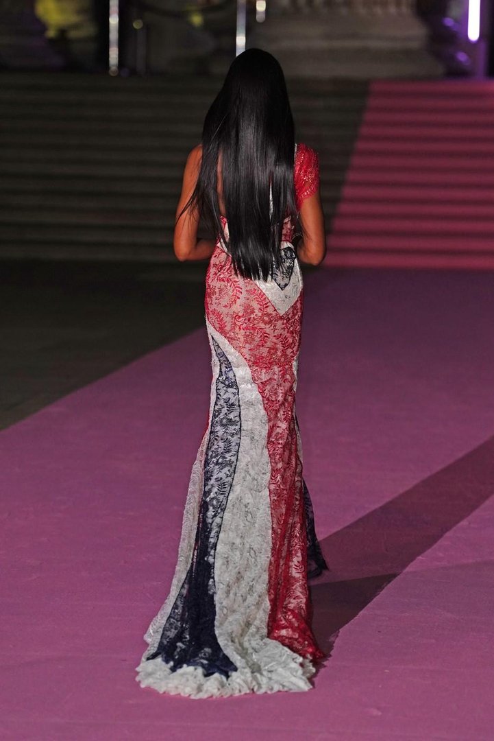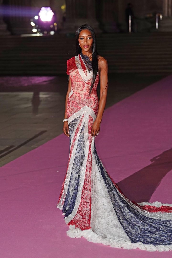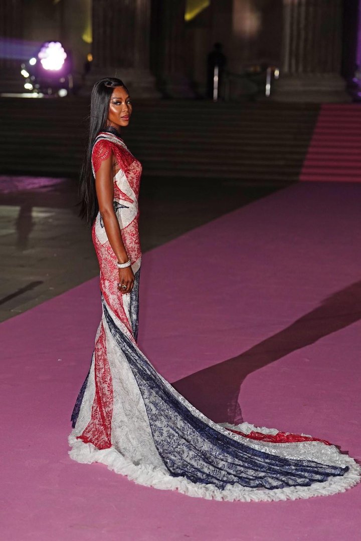 Naomi se je po rdeči preprogi sprehodila v vintage obleki znamke Givenchy, ki jo je oblikoval legendarni Alexander McQueen. Gre za pravo mojstrovino iz čipke, ki na "visokomoden" način interpretira britansko zastavo. Rdeča, bela in modra se zlivajo v razkošnem vzorcu, ki deluje kot gibajoča se skulptura. Dolga čipkasta vlečka v treh barvah se je graciozno zibala za njo, kroj pa je popolno objel njeno silhueto.