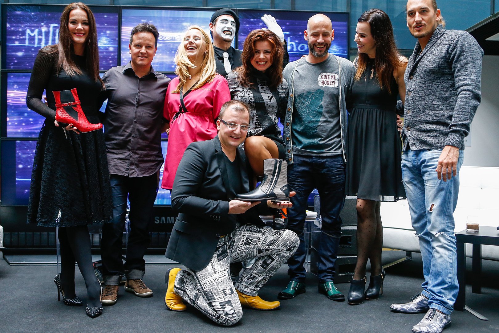 Peter Poles, Vid Valič, Rebeka Dremelj, Neisha in Rok Golob so na odru skupaj z voditeljico zakorakali v nove zgodbe v udobnih in unikatnih čevljih, ki jih je za to priložnost posebej zanje izdelal Mitja.