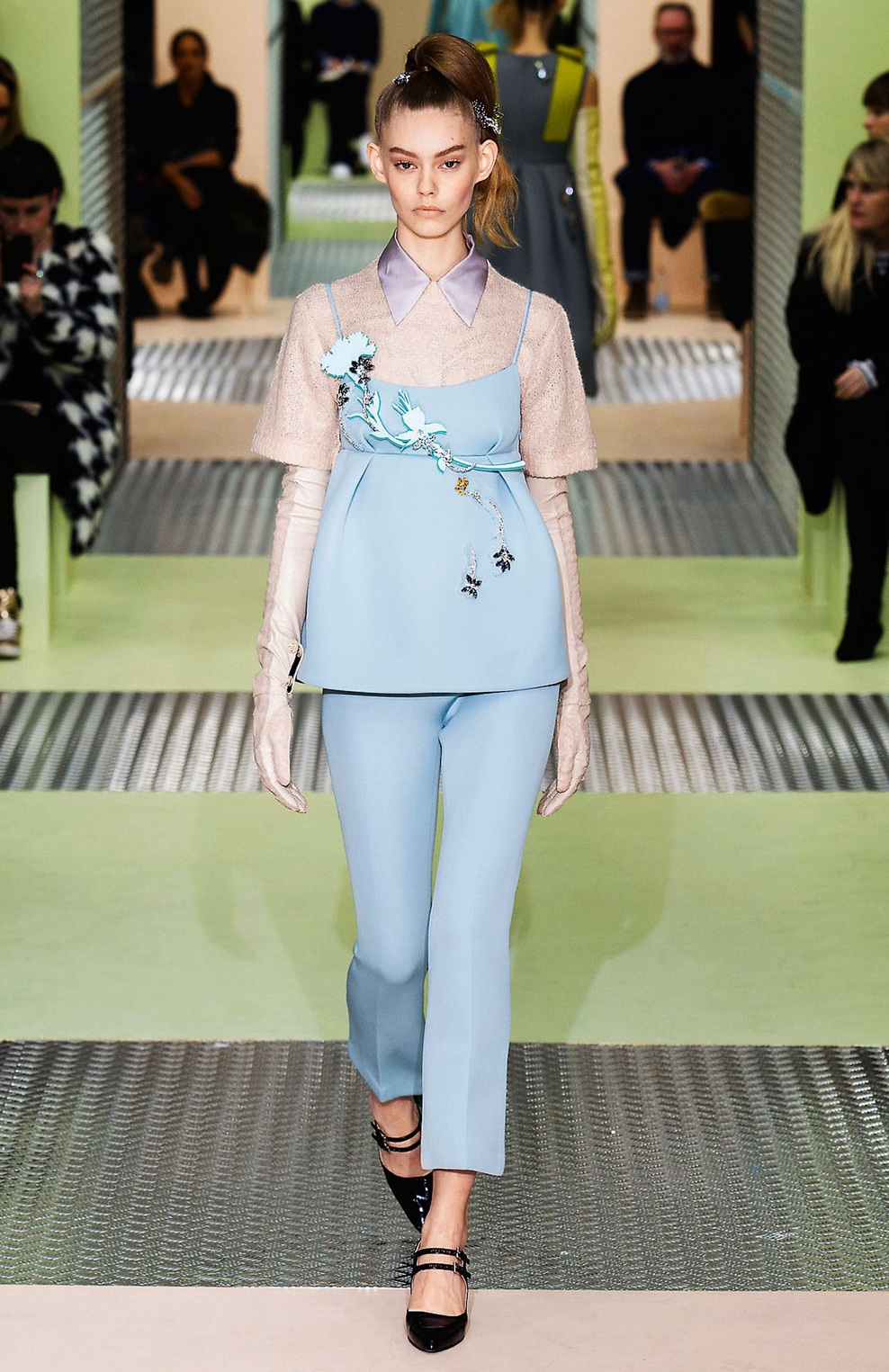 Po zgledu Miuccie Prade bomo otroško razigrane. Igrale se bomo z nedolžno modrimi ter pudrasto rožnatimi odtenki, ki jih nadgradijo damsko zaobljene linije, bižuterija in delikatni materiali.
